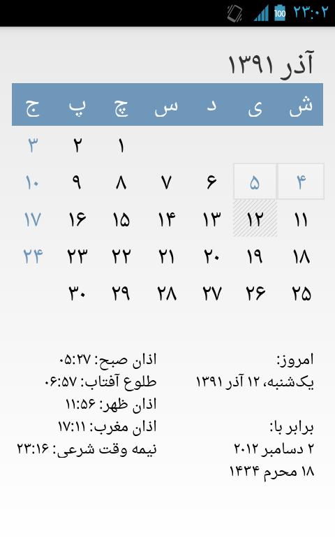 Persian Calendar App For Android 2024. Persian Calendar is FREE to download. Persian calendar or Iranian calendar is official calendar in Iran and Afghanistan. Supports Gregorian and Islamic calendars support also. Permissions run at startup Allows the app to have itself started as soon as the system has finished booting. There are also following features in the app – – The Quran Recitation, – Periodic events and event. Sometimes called Shamsi or Hijri calendar. An app widget can be added in the home screen to show the upcoming two prayer times. Free and open-source Persian Calendar with Compass/Qibla and Athan, and Dari, Kurdish, Azeri, Pashto, Arabic, Gilaki, English, Turkish, Japanese, Spanish, Chinese and French.